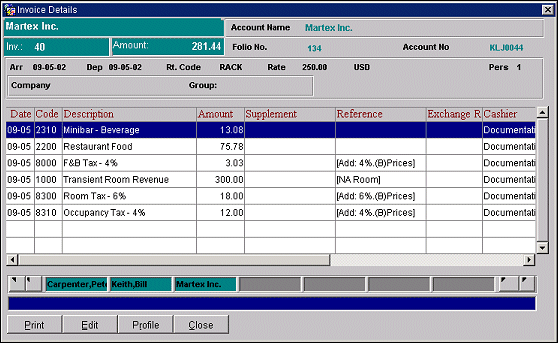 This screen shows the individual transactions charged to the guest. This is the same screen that appears when you select the View button from the AR Account screen. (To access the AR Account screen, select AR > Account Maintenance and select the account you are interested in.) However, when you access the Invoice Details screen from the Transfer Accruals to AR screen, the New and Adjust buttons are never available.